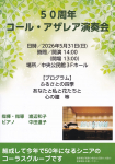 50周年 コール・アザレア演奏会 お知らせ 2026/03/14 日時:2026年5月31日 開演14:00 開場13:00会場:佐野市中央公民館3Fホール曲目:ふるさとの四季、あなたと私と花たちと、心の瞳 他 詳細はこちら