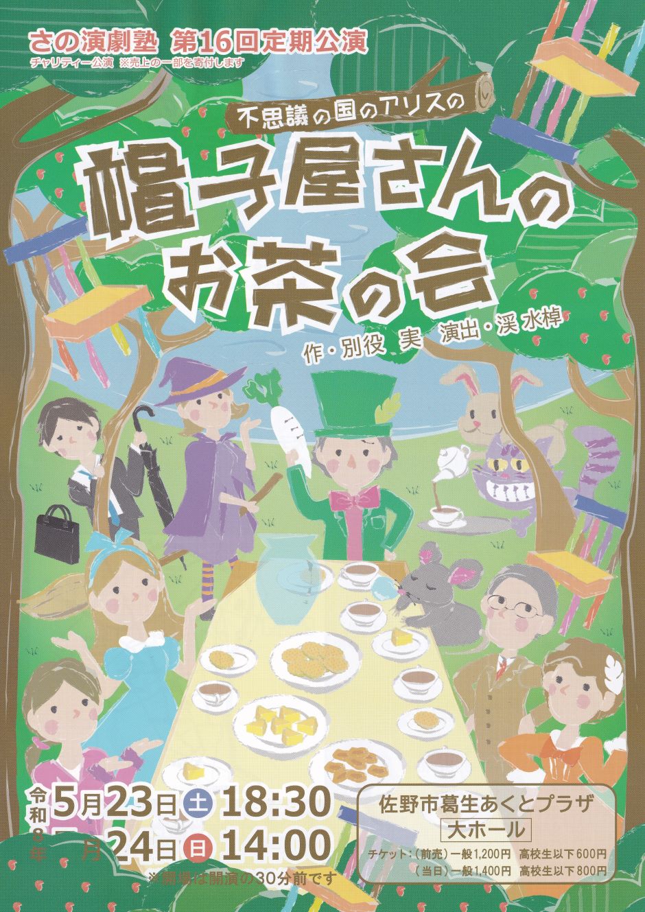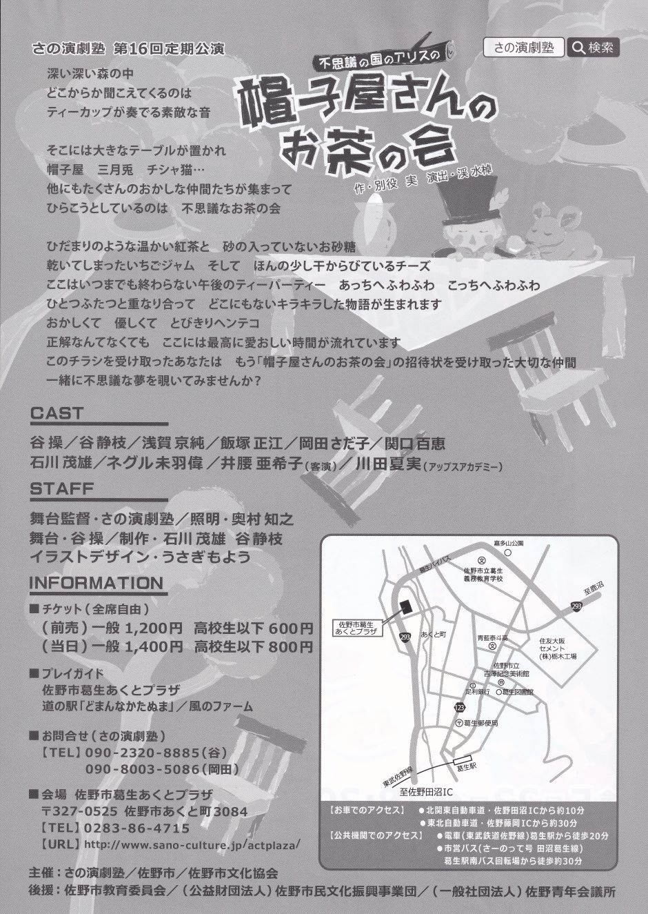 さの演劇塾 第16回定期公演 2026/03/14 日時:①令和8年5月23日(土)開演18:30(開場18:00) ②令和8年5月24日(日)開演14:00(開場13:30) 会場:佐野市葛生あくとプラザ大ホール チケット: (前売)一般1,200円 高校生以下600円 (当日)一般1,400円 高校生以下800円 イベント申込はこちら 一覧に戻る